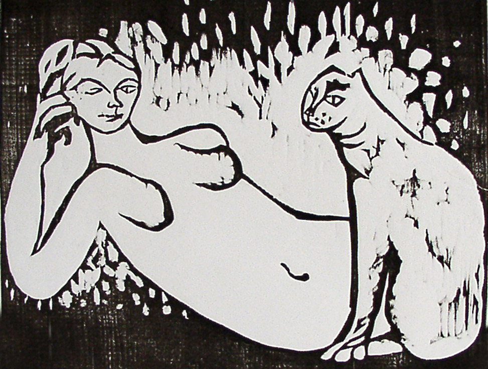 Als Buch-Cover wählte mein Neffe Paul Rutrecht, der mittlere Sohn meiner Schwester Almut, den frühen Holzschnitt „Liegender Akt mit Kater“, WVZ Nr. 16 von 1960.